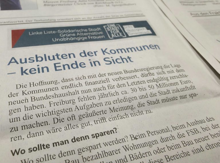 Die Hoffnung, dass sich mit der neuen Bundesregierung die Lage der Kommunen endlich finanziell verbessert, dürfte sich mit dem neuen Bundeshaushalt nun auch für den Letzten endgültig zerschlagen haben. Freiburg fehlen jährlich ca. 30-50 Millionen Euro, um die wichtigsten Aufgaben zu erledigen und die Stadt zukunftsfit zu machen. Die oft geäußerte Meinung, die Stadt müsste nur sparen, dann wäre alles gut, trifft einfach nicht zu.