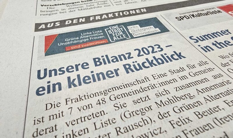 Die Fraktionsgemeinschaft EINE STADT FÜR ALLE ist mit 7 von 48 Gemeinderät:innen im Gemeinderat vertreten. Sie setzt sich zusammen aus der Linken Liste (G. Mohlberg, ...