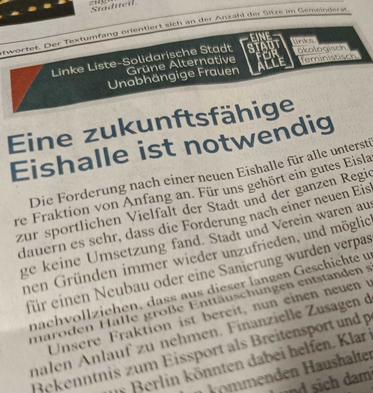 Die Forderung nach einer neuen Eishalle für alle unterstützt unsere Fraktion von Anfang an. Für uns gehört ein gutes Eislaufangebot zur sportlichen Vielfalt der Stadt und der ganzen Region. Wir bedauern es sehr, dass die Forderung nach einer neuen Eishalle zu lange keine Umsetzung fand. Stadt und Verein waren aus verschiedenen Gründen immer wieder unzufrieden und mögliche Zeitpunkte für einen Neubau oder eine Sanierung wurden verpasst. Wir können nachvollziehen, dass aus dieser langen Geschichte und der heutigen maroden Halle große Enttäuschungen entstanden sind.